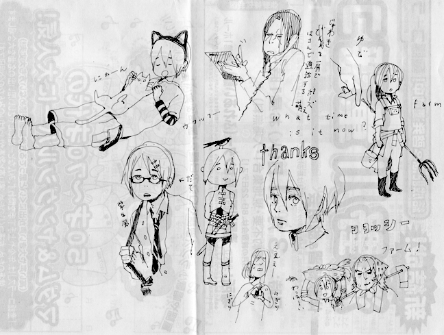 まんなかの折り目は、描いた後食卓の上にうっかり置きっぱなしにしたらおかあさまが容赦なく半分にたたんで処分しようとしてくださった跡です。あと数ミリ横にずれてたら泣いてたよ。高校の時に先生が「自分の作品を親がないがしろに扱わなくなったら一人前」というような事を言っていたのを思い出しました。まだまだ自分は未熟者というわけですね。ちえっ。というか一人前になりたいなら広告の裏に描くなよって話ですね。ちえっ。